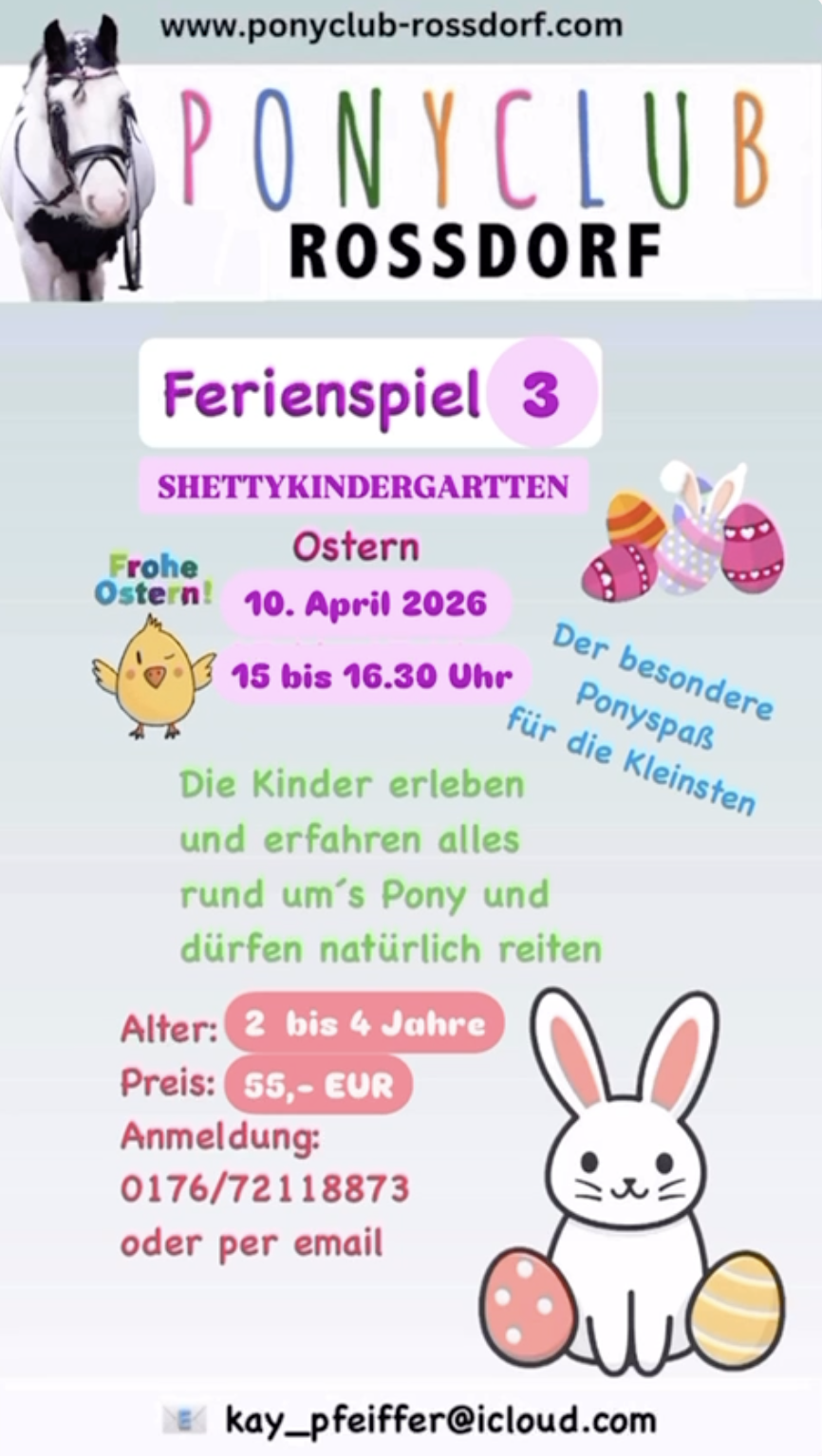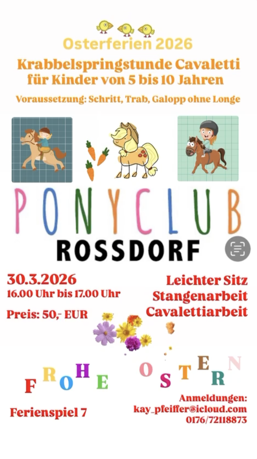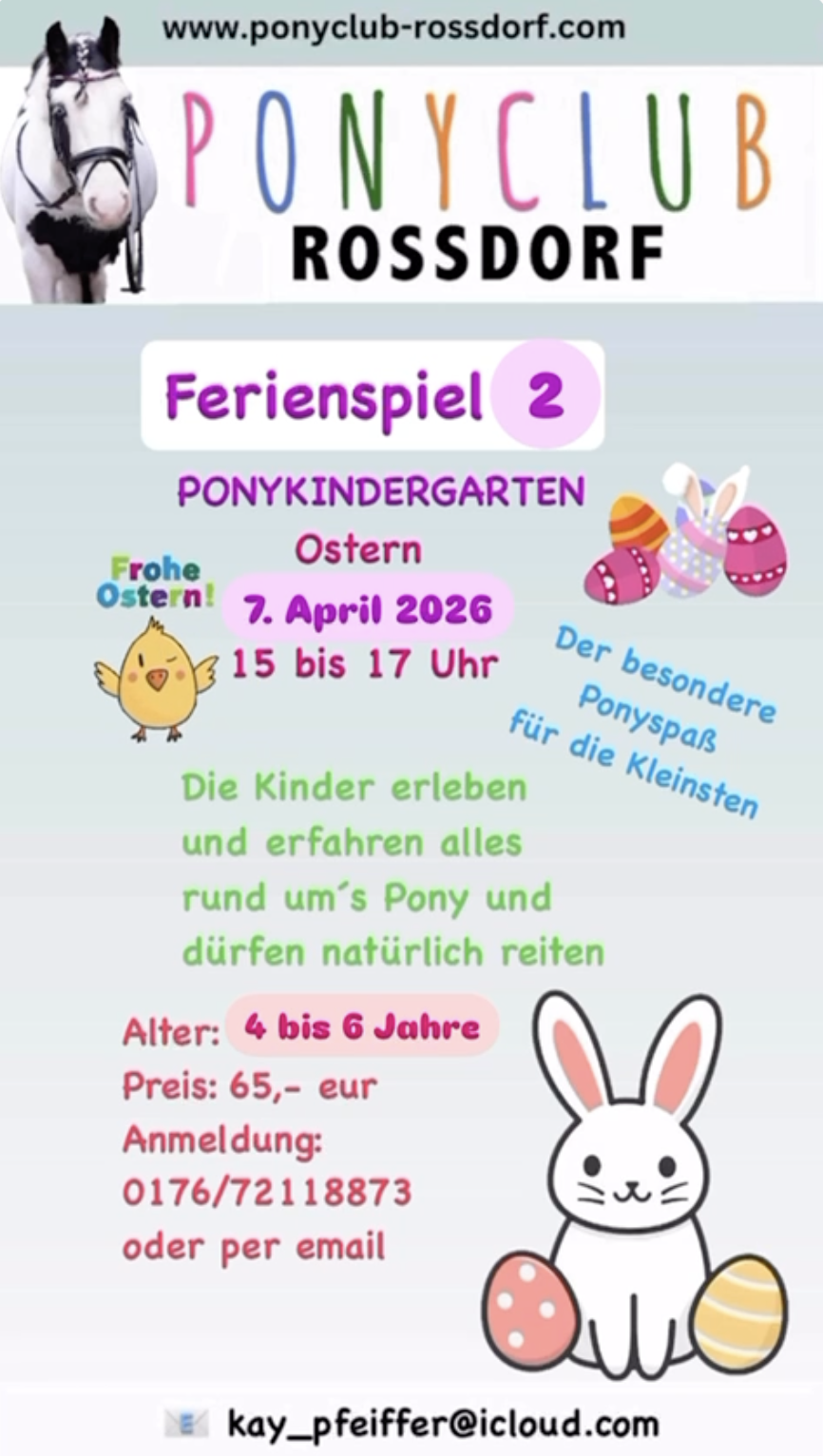 Natürlich sind wir auch bemüht, neben dem Leistungsstand, die Gruppen bei Kindern und Jugendlichen zusätzlich nach dem Alter einzuteilen. Kleine oder auch längere Ausritte über Stock und Stein und viele Events für Groß und Klein mit den Pferden oder Ponys werden über das ganze Jahr hindurch angeboten. Vielleicht möchte der ein- oder andere „kleine Reiter“ auch mal ein echtes Turnier besuchen ...? Es lohnt sich, immer mal wieder hier auf der Seite reinzuschauen, hier werden ständig wechselnde Events angeboten.