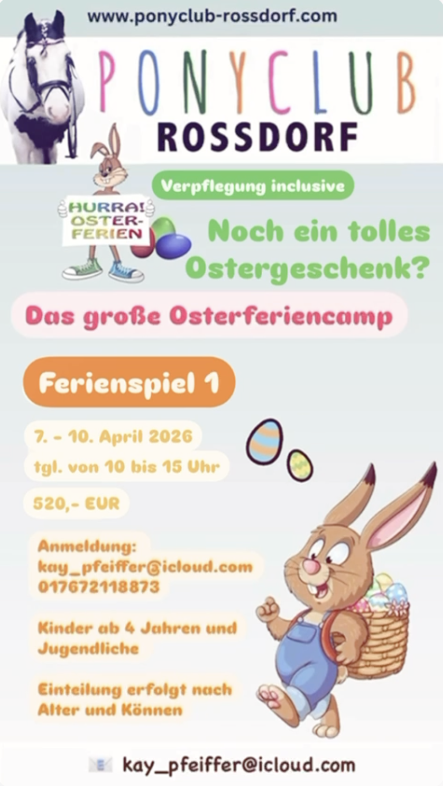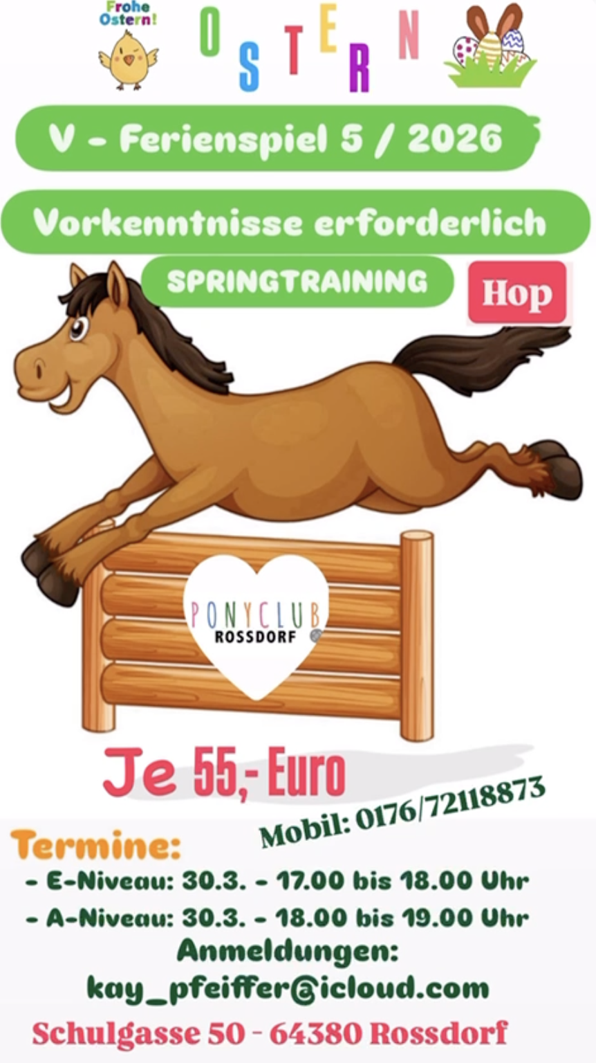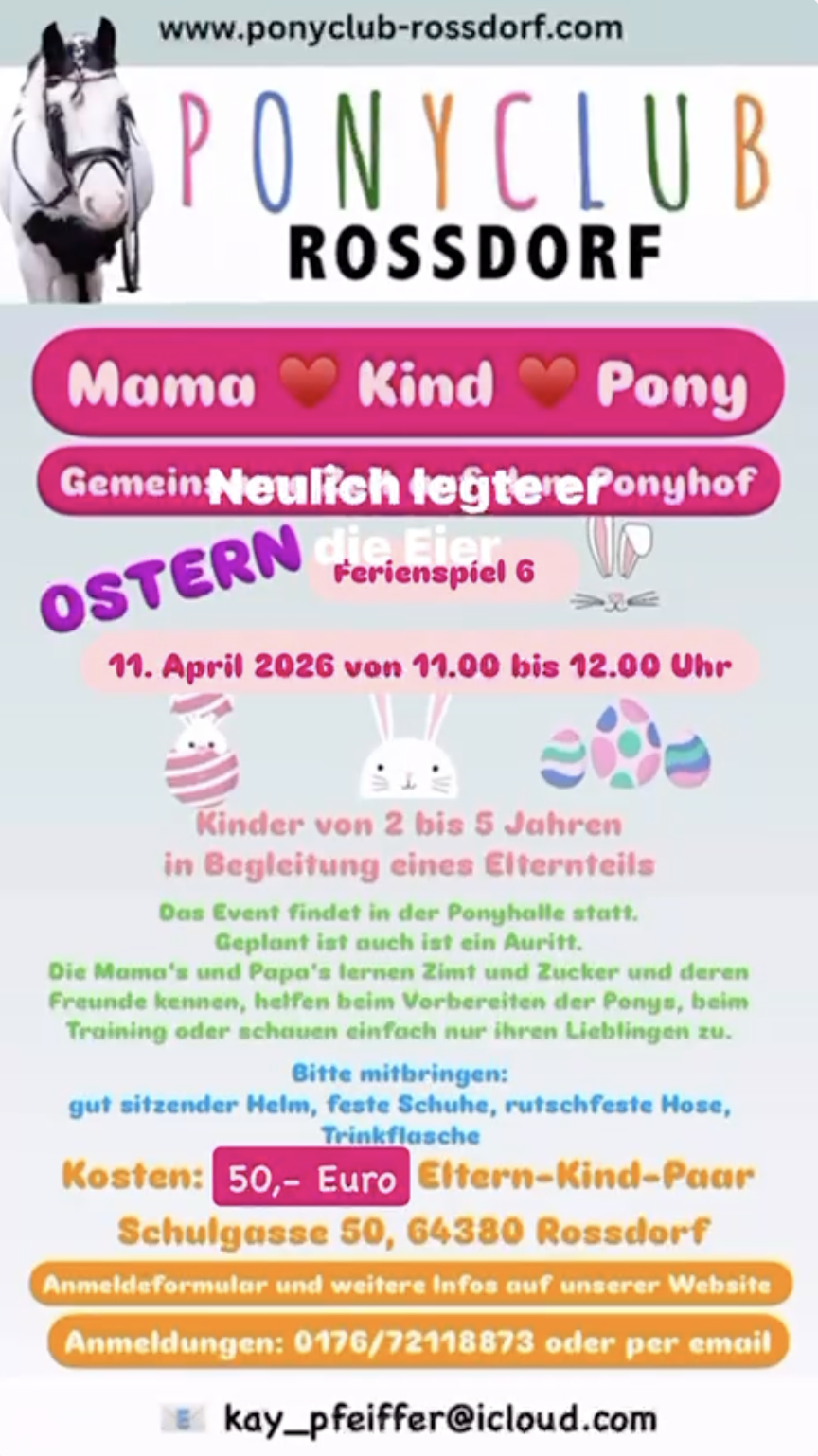 Natürlich sind wir auch bemüht, neben dem Leistungsstand, die Gruppen bei Kindern und Jugendlichen zusätzlich nach dem Alter einzuteilen. Kleine oder auch längere Ausritte über Stock und Stein und viele Events für Groß und Klein mit den Pferden oder Ponys werden über das ganze Jahr hindurch angeboten. Vielleicht möchte der ein- oder andere „kleine Reiter“ auch mal ein echtes Turnier besuchen ...? Es lohnt sich, immer mal wieder hier auf der Seite reinzuschauen, hier werden ständig wechselnde Events angeboten.